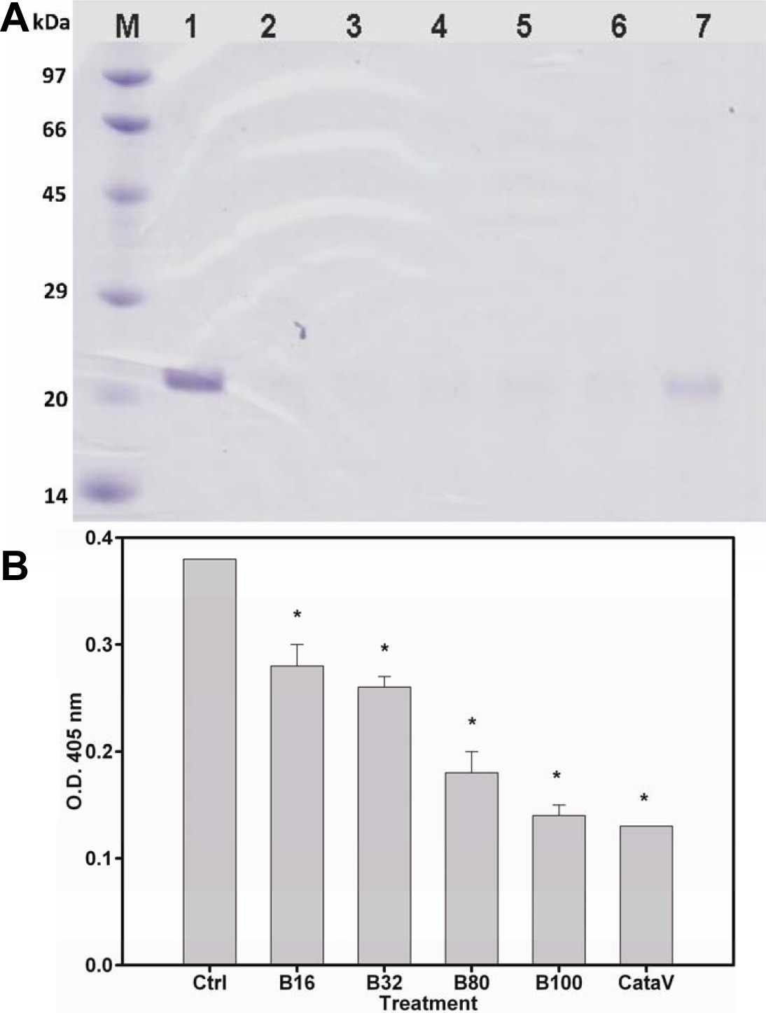 equivalent to 80 μM PRX, B100: catalin equivalent to 100 μM PRX, CataV: catalin-formulated vehicle only. *p<0.05 versus control