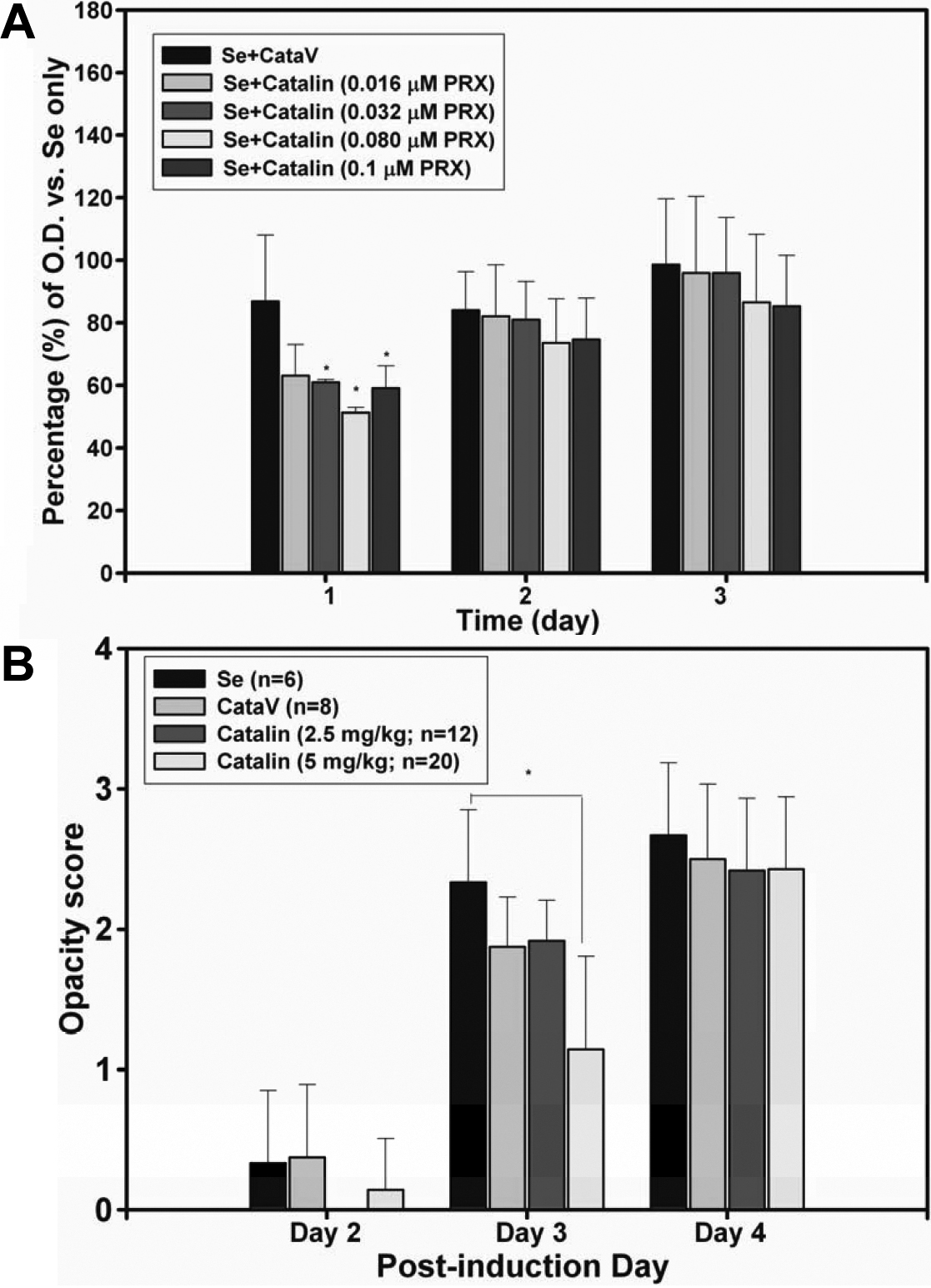at 405 nm. *catalin (0.032–0.1 μM PRX) versus CataV at p<0.05. B: Average cataract scores of groups treated with various doses of catalin in a selenite-induced cataract rat model. Rats (n=6~20)