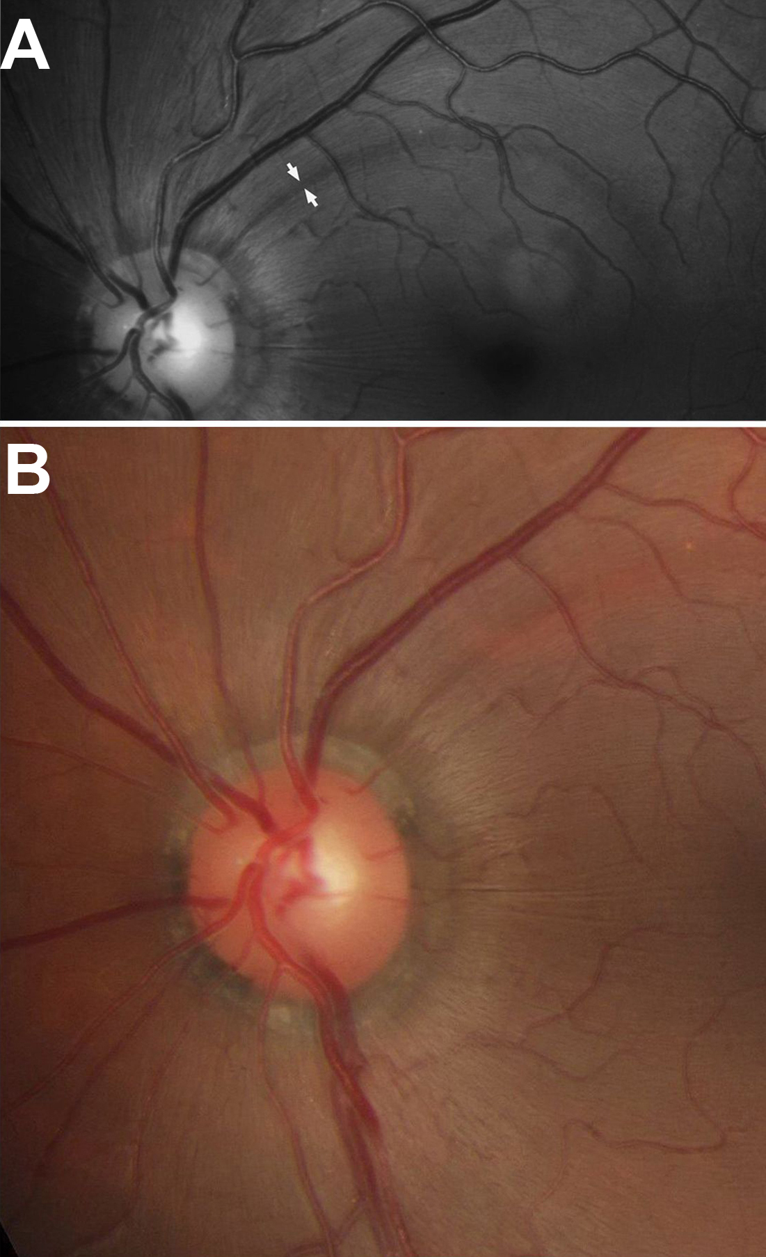 a thin sector defect (included between arrows). B: A stereophotograph of the same eye shows the telltale yellow discoloration of the retinal nerve fiber layer streaks.