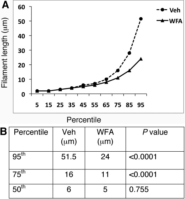 21]. Graphical representations of GFAP filament lengths as percentiles are shown between vehicle-treated and WFA-treated samples