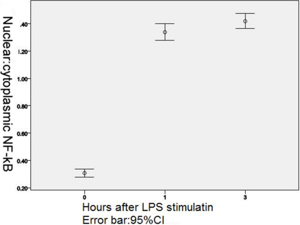 Nuclear factor translocation with LPS stimulation in C3H/HeN mouse peritoneal macrophages. Immunofluorescence staining of nuclear/cytoplasmic ratios of NF-кB nuclear translocation in LPS stimulated macrophages.