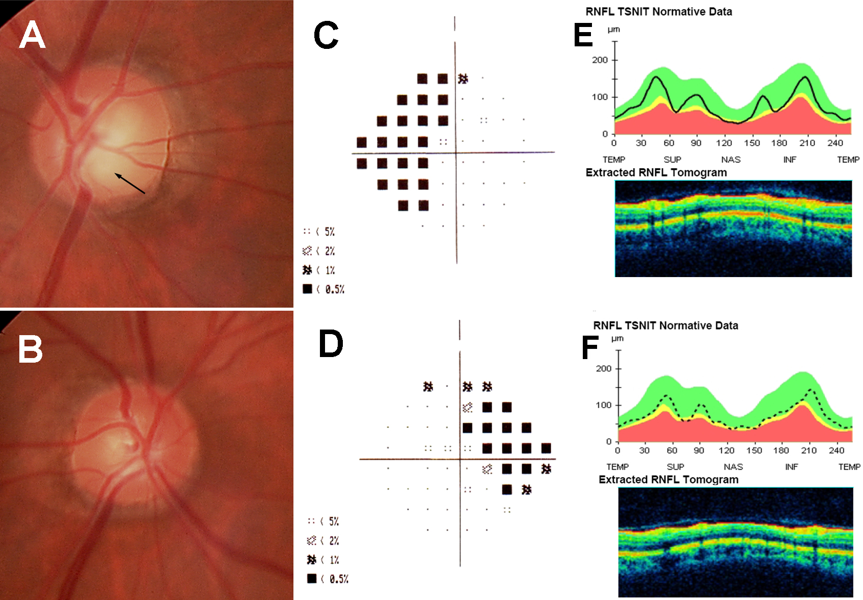 and B). The arrow shows the slight loss of the neuroretinal rim