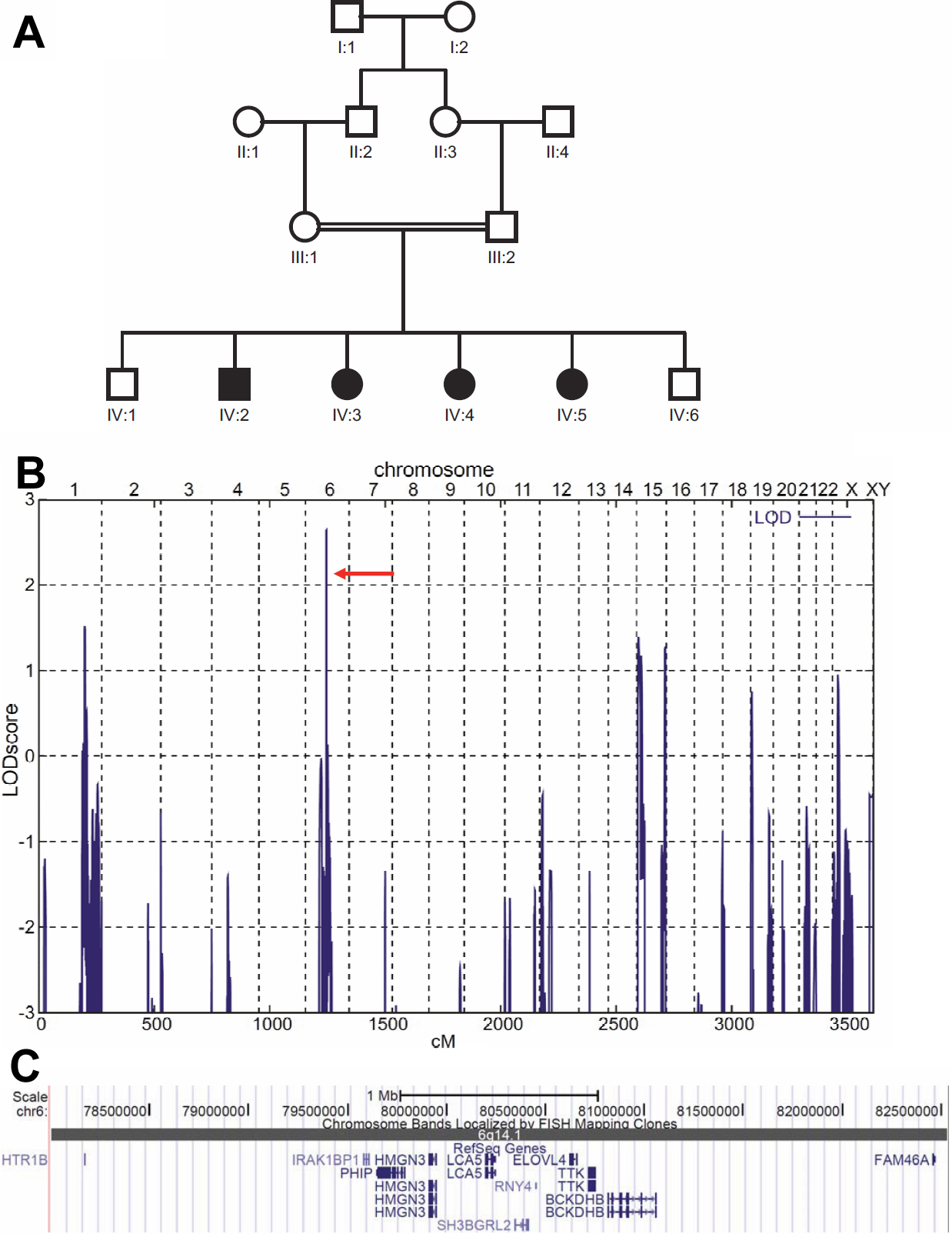 B: Graphical view of LOD score calculations of genomewide SNP mapping in the BUIT-LA01 family. LOD scores calculated with ALLEGRO