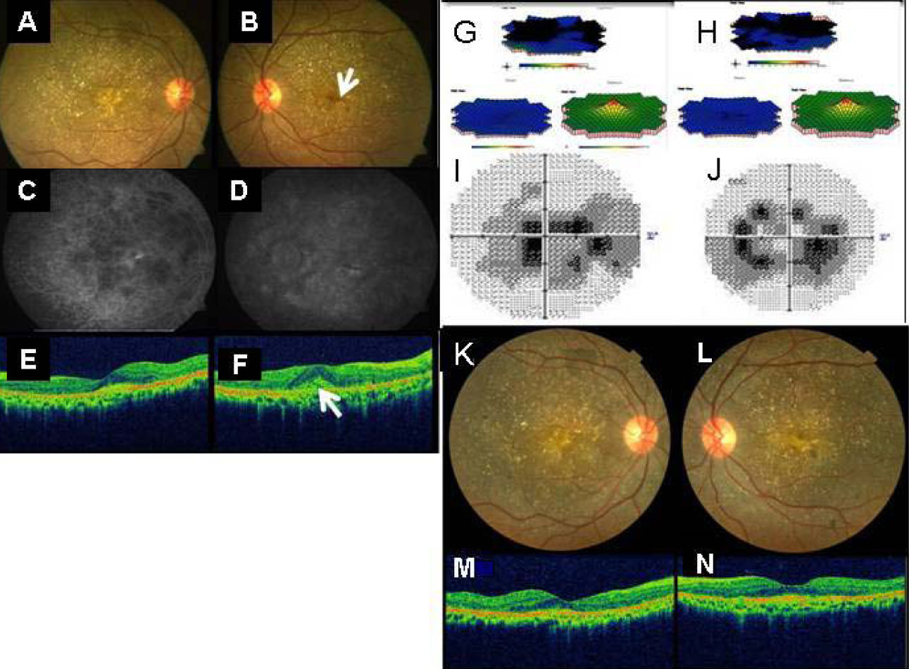 both eyes. I, J: Visual field defects were also noted on Humphrey visual field perimetry. K, M: Color fundus photo and OCT of right eye at last follow-up. L: Post Ranibizumab treated color fundus photograph of left eye showed scarred CNV as confirmed by OCT (N) at last follow-up.