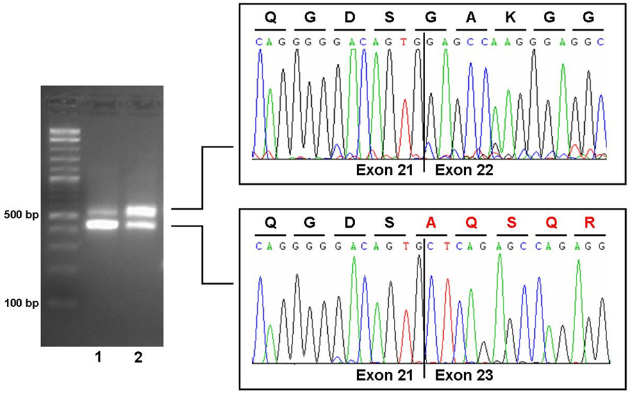 band for the exon 22 skipped product. Sequencing of the different products showed unaltered splicing for the larger product