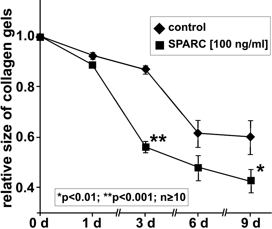 Figure 4. SPARC promotes HTF cell-mediated collagen gel contraction. Effects of 100 ng/ml SPARC on HTF-mediated collagen contraction