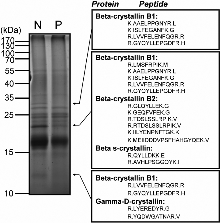 left panel, a total of 10 μg lens proteins derived from normal (N) and cataractous (P) eye lenses were resolved with 12.5%