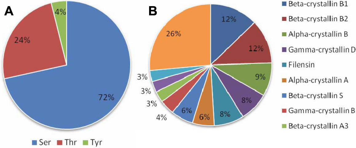on serine (72%) was more common than threonine (24%) and tyrosine (4%). B: Proportions of the identified proteins with phosphorylation in normal human lens proteins. The proportions of phosphopeptides