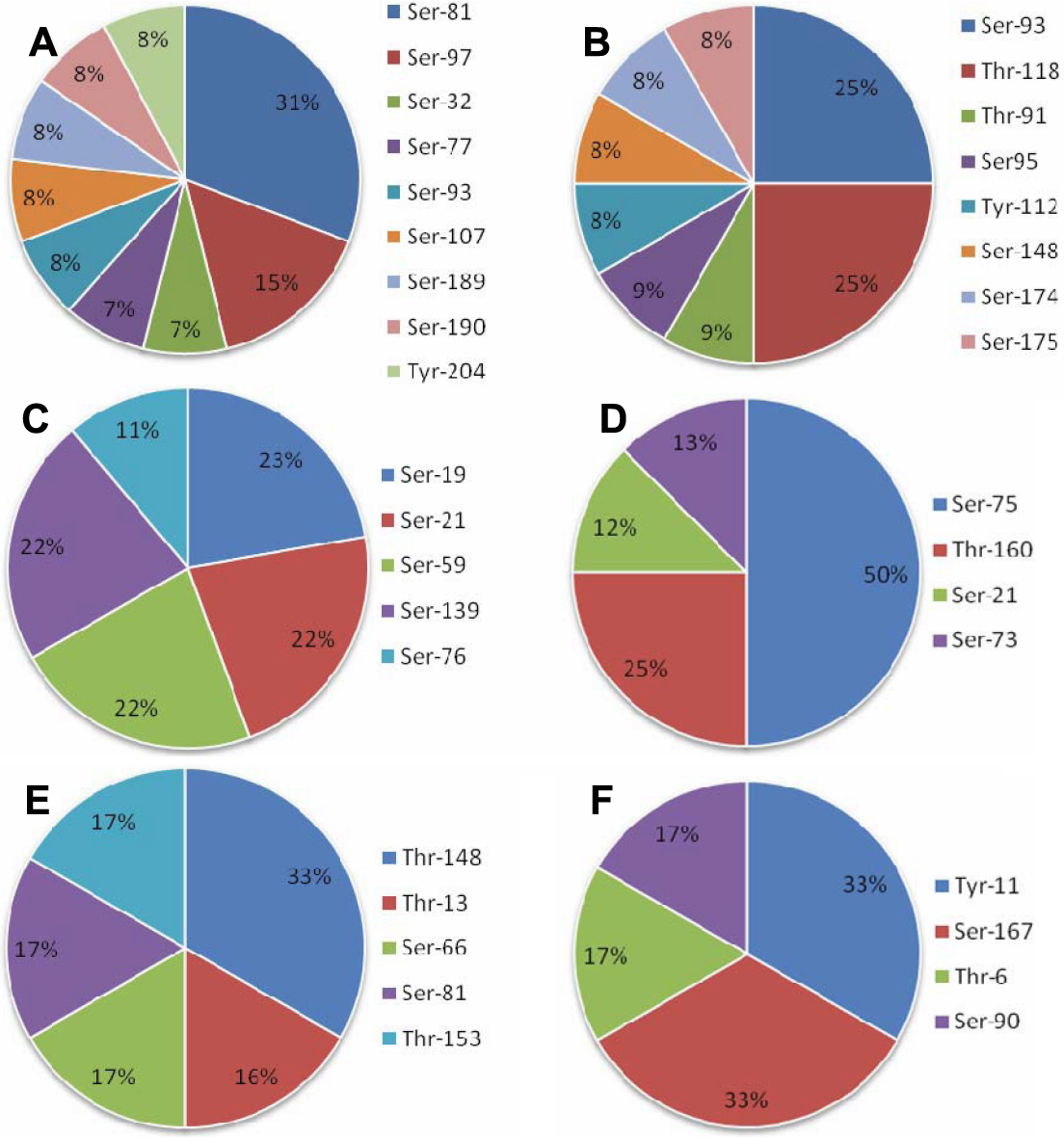 of in vivo phosphorylation sites in A: βB1-crystallin; B: βB2-crystallin; C: αB-crystallin; D: γD -crystallin; E: αA-crystallin; and F: βS-crystallin. Ser-81 (31%) and Ser93/Thr-118 (25%) are the predominant phosphorylation-sites in βB1-crystallin and βB2-crystallin,