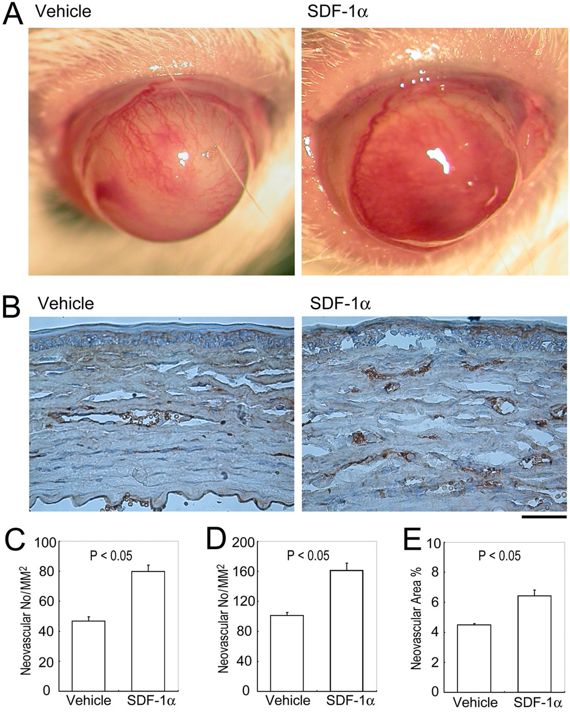 Scale bar, 50 μm. C: CNV numbers per square millimeter in whole section. D: CNV numbers per square millimeter in hot spots. E: Proportions of CNV areas in hot spots were determined from the corneas obtained from vehicle- or SDF-1α-treated BABL/c mice