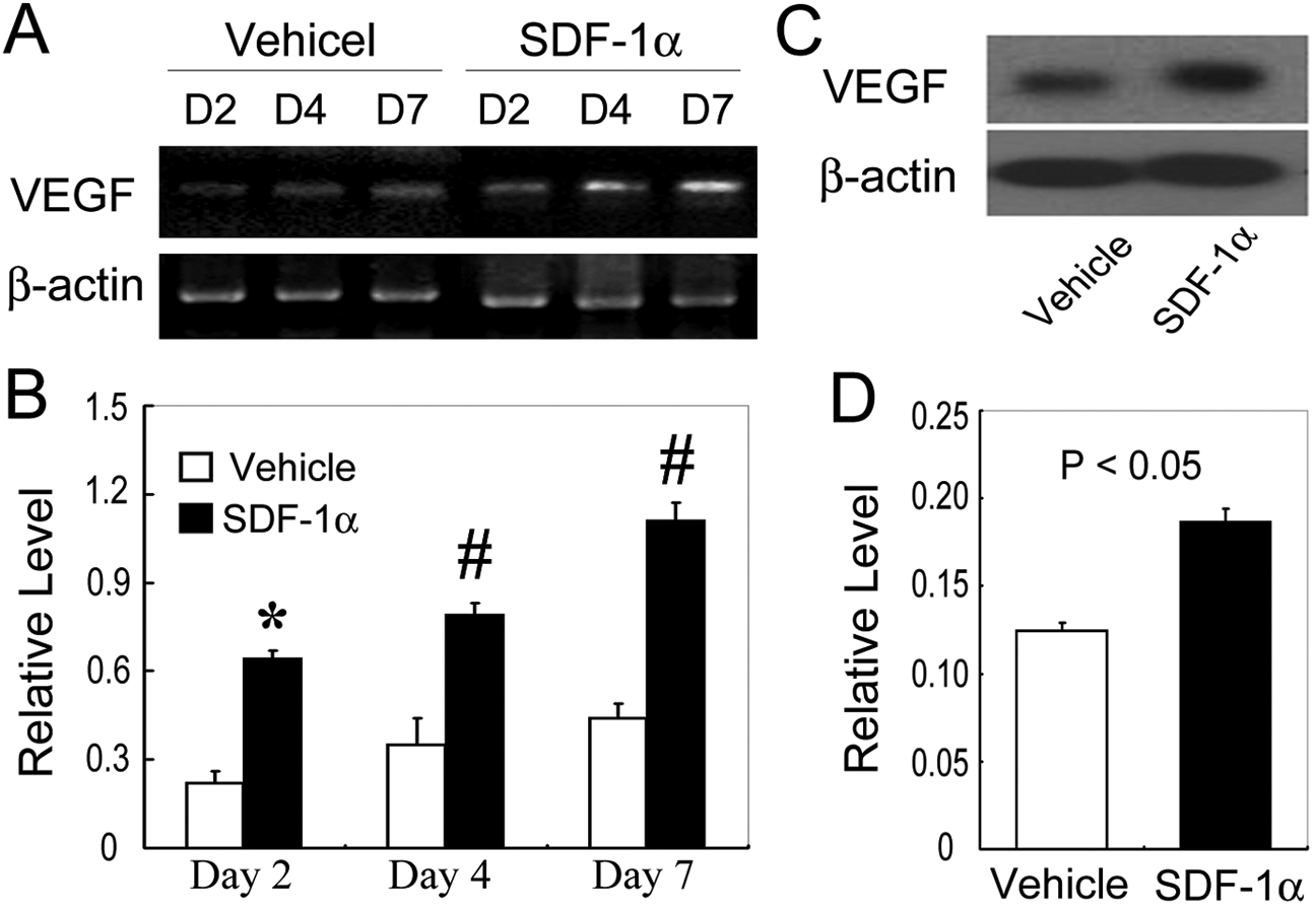 experiments are shown here. D: Ratios of VEGF to β-actin protein bands of vehicle- (open bars) and SDF-1α-treated mice (black bars) were determined as