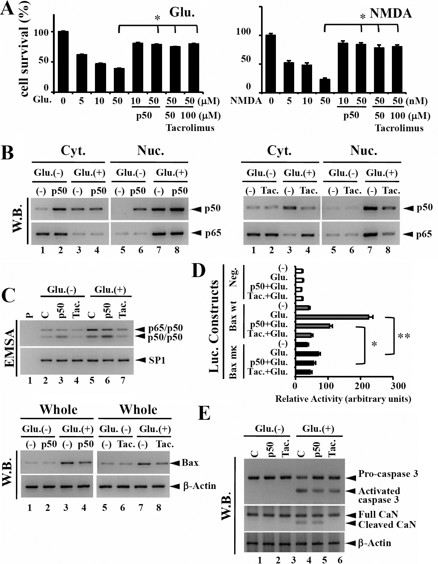 E: western blot analysis indicates the effects of p50 overexpression or tacrolimus (Tac.) pre-treatment on caspase 3 and calcineurin
