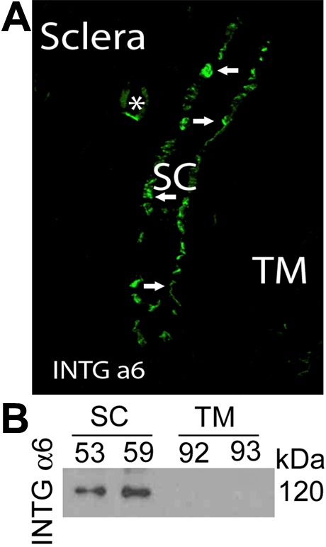 Figure 4. Integrin α6 subunit expression by Schlemm’s canal cells. A: Confocal immunofluorescence microscopy of outflow tissues including Schlemm’s canal (SC) from human donor eyes showing α6
