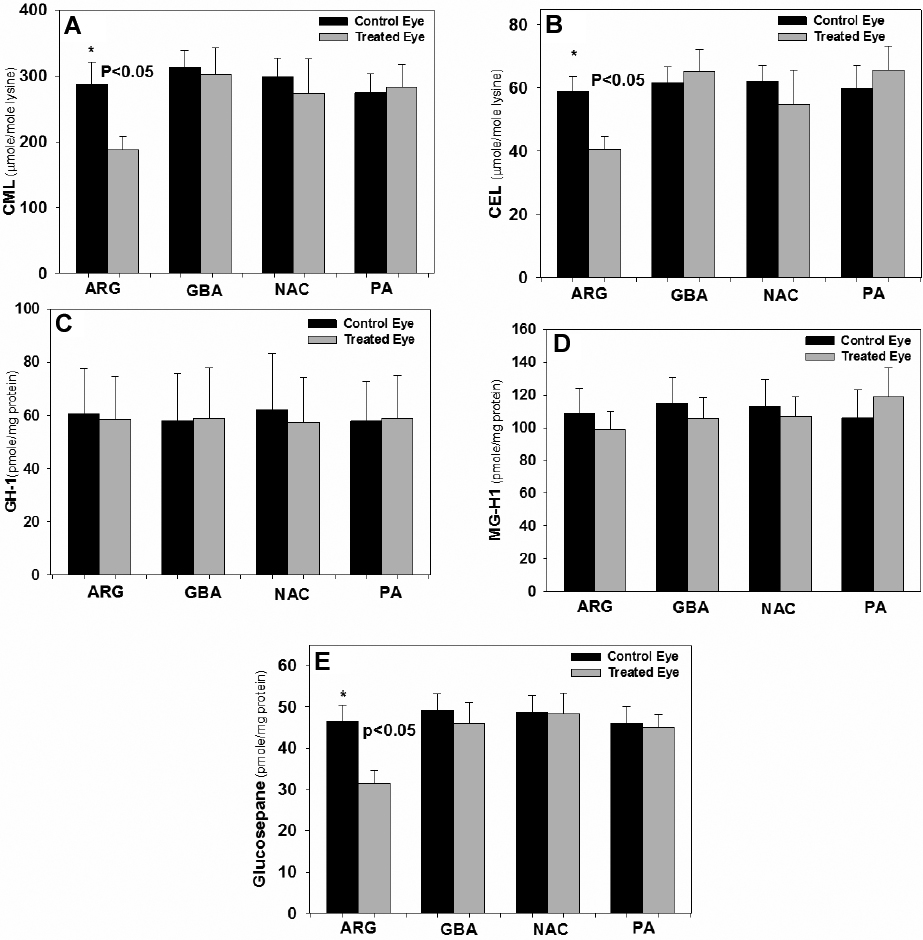 E: Mouse lens protein glucosepane levels were significantly reduced by L-arginine (p<0.05). One-way ANOVA was used followed
