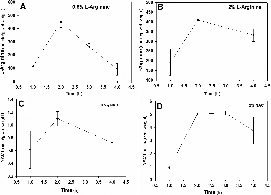 Figure 5. Uptake kinetics of L-Arginine and NAC in rabbit lens. Two rabbits in each group were topically applied with 0.5% inhibitor