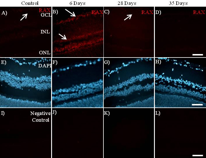 The retinas of diabetic rats show a strong cytoplasmic expression of RAX at 6 days (B) after STZ injection when compared to normal rats (A). The RAX expression in the retinas of diabetic animals at 28 days (C) and 35 days (D) after STZ injection was strongly reduced to the level of normal rats (A). The nuclei of cells (E, F, G, and H) were stained with the 4',6-diamidino-2-phenylindole (DAPI, blue) and the negative controls sections (I, J, K, and L) were incubated without the anti-RAX antibody. The negative control sections (incubated without the anti-RAX antibody) of