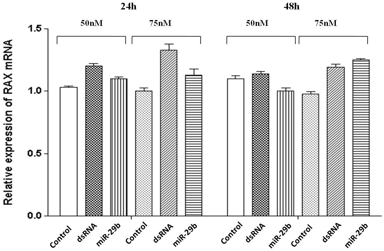 Figure 8. PKR associated protein X (RAX) mRNA expression in the presence of a microRNA-29b mimic. The expression of RAX mRNA was evaluated by qRT–PCR in CJ4 cells transfected with an miR-29b mimic or dsRNA (negative control) at a concentration of 50 or 75 nM, 24 h (A) and 48 h (B) after transfection. Nontransfected CJ4 cells were used as a control. Data are means±standard error of the mean from three