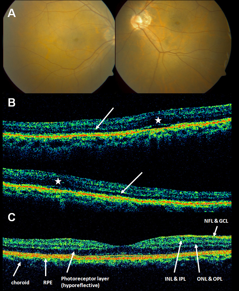 Figure 1. A: Fundus photography of patient 1 (P1) demonstrating bilateral cystoid-like macular lesions. There are no pigmentary changes.