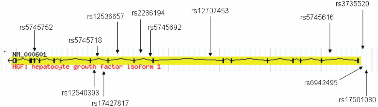 Figure 1. HGF gene idiogram depicting the location of all tagging SNPs, with the previously published hyperopia SNPs (above the line).