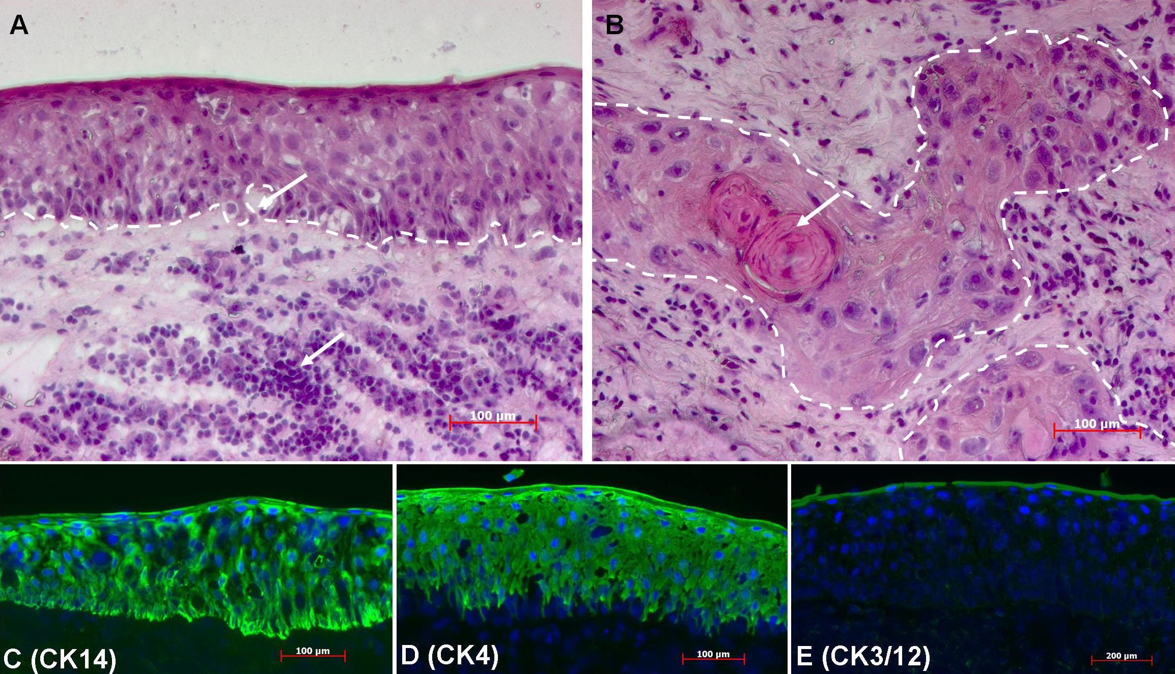 for the basal layer. E: Weak CK3/12 staining of the SCC
