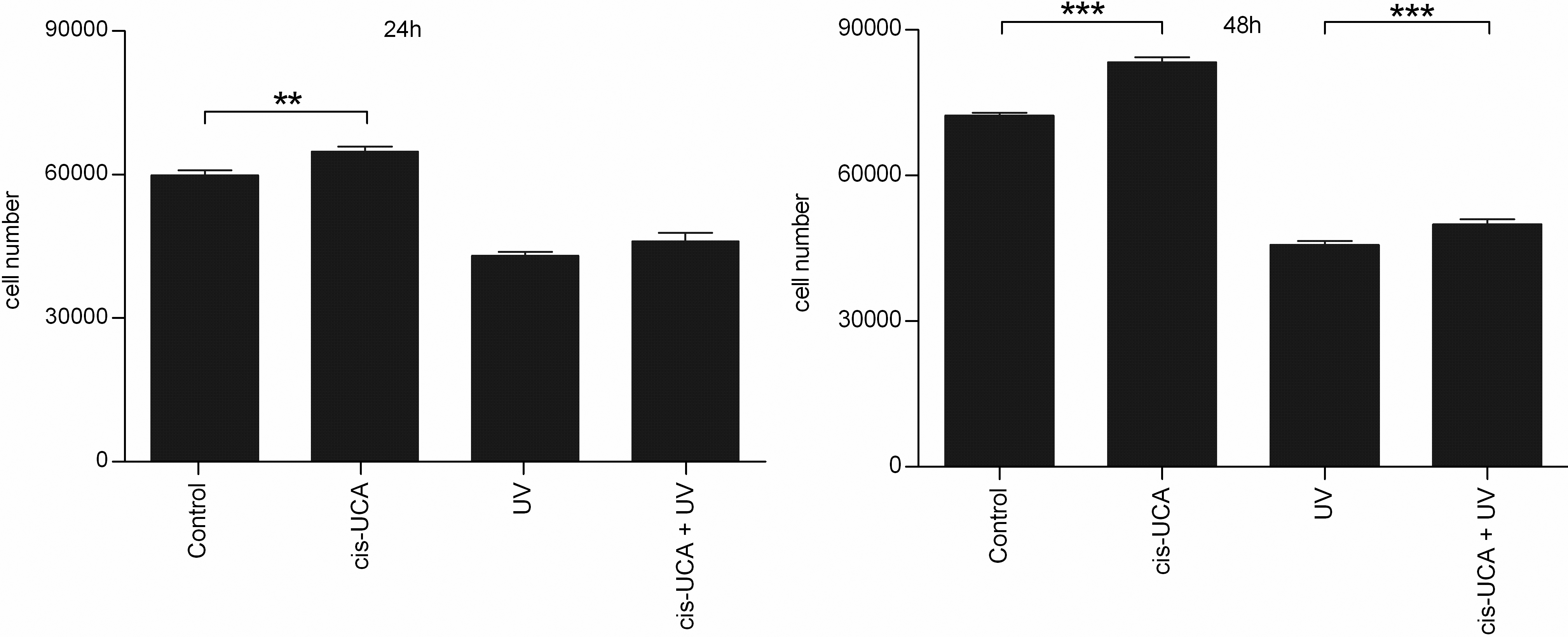 Proliferation of HCE-2 cells. Results are presented as mean cell numbers ±SEM cis-UCA concentration was 100 µg/ml. Eight parallel samples were measured in all groups. **p<0.01; ***p<0.001 (Mann–Whitney).