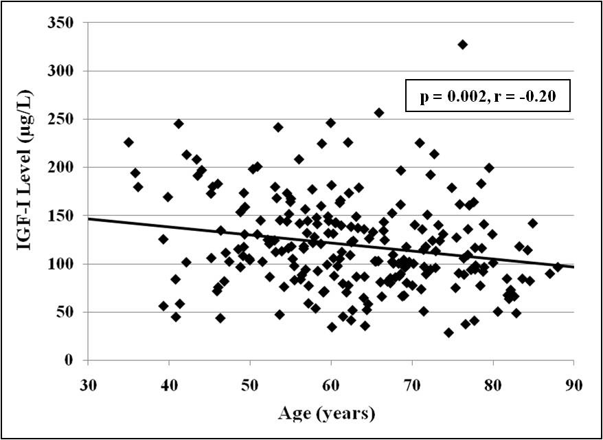 Serum insulin-like growth factor (IGF)-I concentration in relation to age. When all study subjects were considered, there was a statistically significant inverse correlation between serum IGF-I concentration and age.