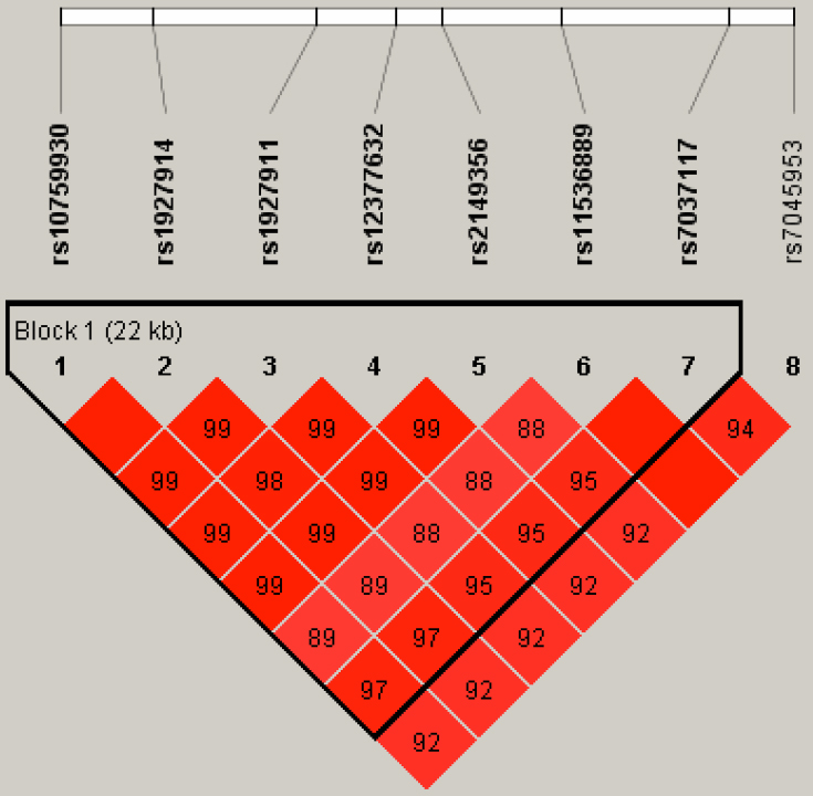 Linkage disequilibrium plot of 8 SNPs of