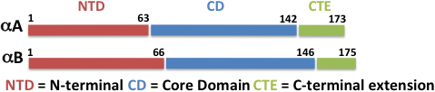 Figure 1. Schematic diagram showing the regions and residue numbers forming the NH2-terminal domain (NTD), core domain (CD), and COOH-terminal extension (CTE) of αA- and αB-crystallins in the current study.