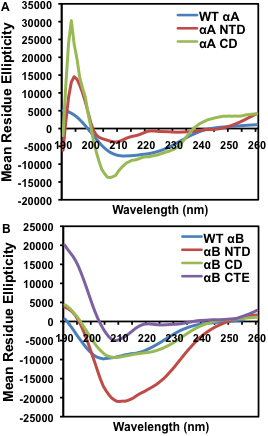 are the average of 5 scans, corrected for the buffer blank, and smoothed. A: WT αA, NH2-terminal domain, and core domain constructs. B: WT αB, NH2-terminal domain, core domain, and COOH-terminal extension constructs.