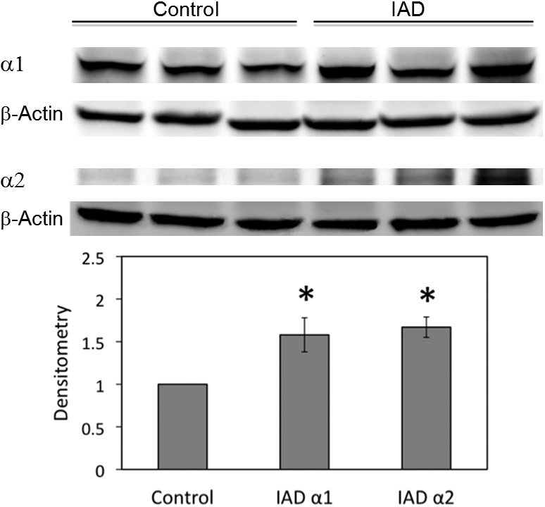 Figure 3. Western blots of α subunits from whole LG homogenates. Both α1 and α2 were significantly increased in LG from rabbits with