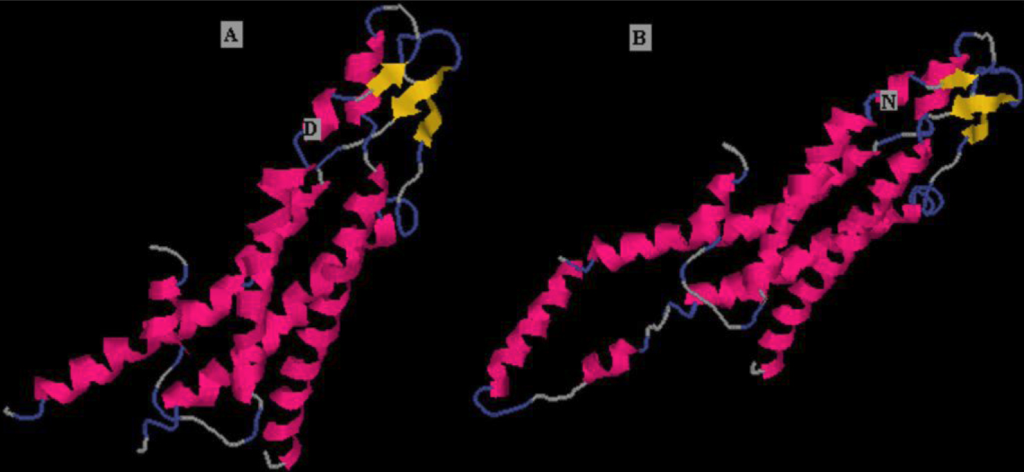 Figure 4. Structure homology modeling and comparison of mutant protein and native human CX26 (2zw3F). A: Native human cx26, B: Mutant protein CX50. Red, yellow and blue indicate α-helix, β-sheet and β-turn, respectively, white indicates other residues.