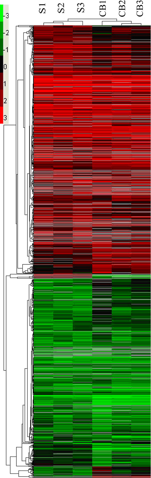 Figure 2. Hierarchical clustering of all 1,386 differentially expressed probes in either the S- or the CB-corneal neovascularization