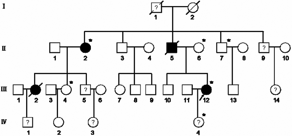 the affected members. Slashed symbols denote that the subject is deceased. Symbols with a question mark in the center indicate