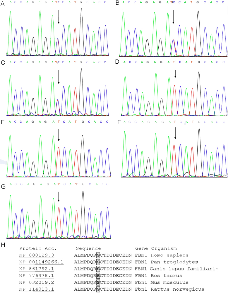 the proband, patient II:2, and the proband’s daughter, IV:4, respectively. D-F show the corresponding normal sequence in unaffected family members II:7 and III:4 and spouse II:6, respectively. G shows the corresponding normal sequence in a healthy member. H displays the sequence alignment of FBN1 orthologs surrounding the mutated site using ClustalW. The serine1235 of the human FBN1 protein is highly conserved in several