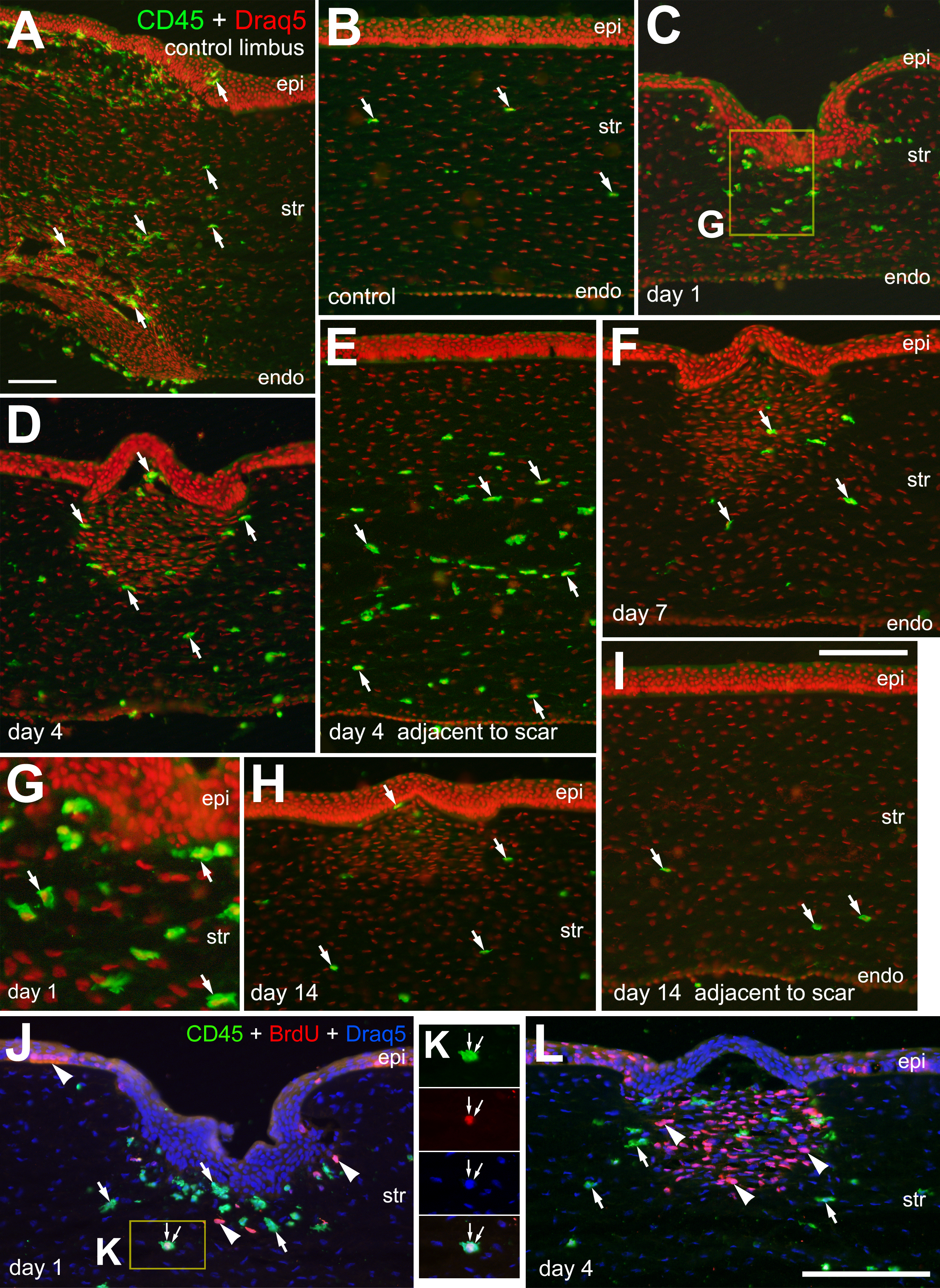 corneas were labeled with Draq5 (red nuclei in A-I;