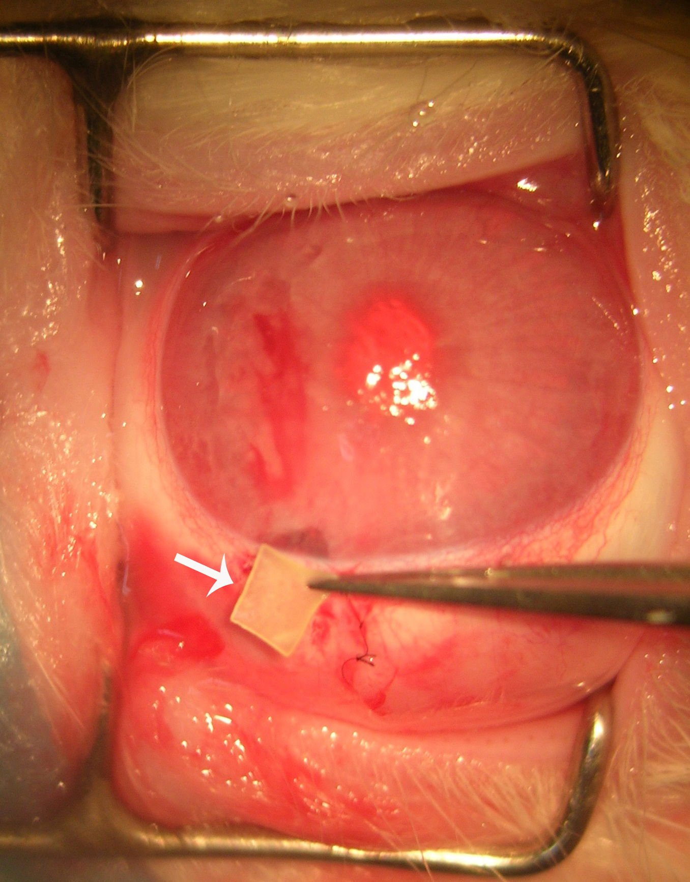 Sustained delivery film application during filtering surgery. A drug delivery film in white sheet form, approximately 2.5 mm×2.5 mm in size (arrow), placed in the surgical area between the conjunctiva flap and scleral flap.