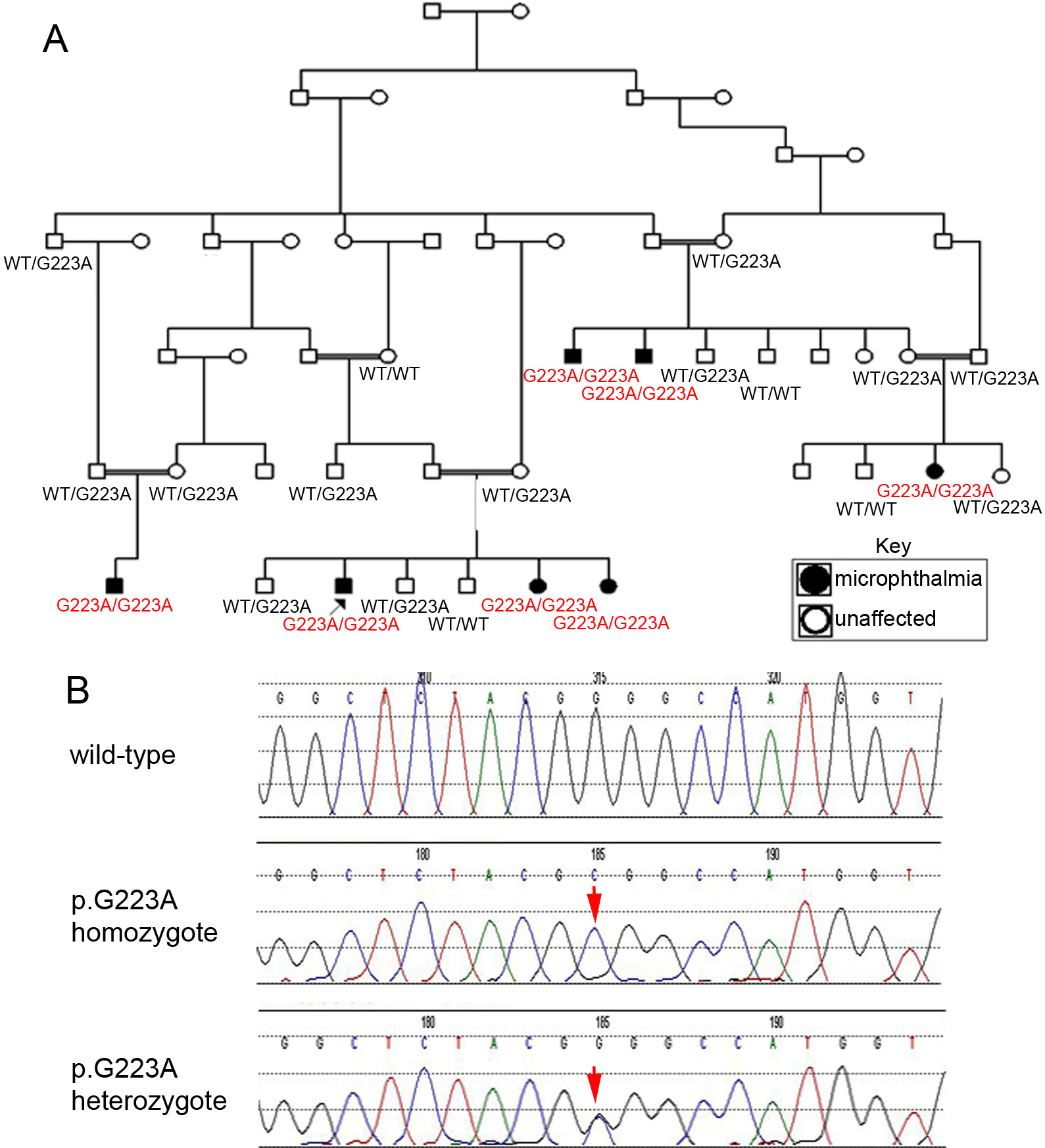 affected individuals are shown in red. WT, wild type. B: