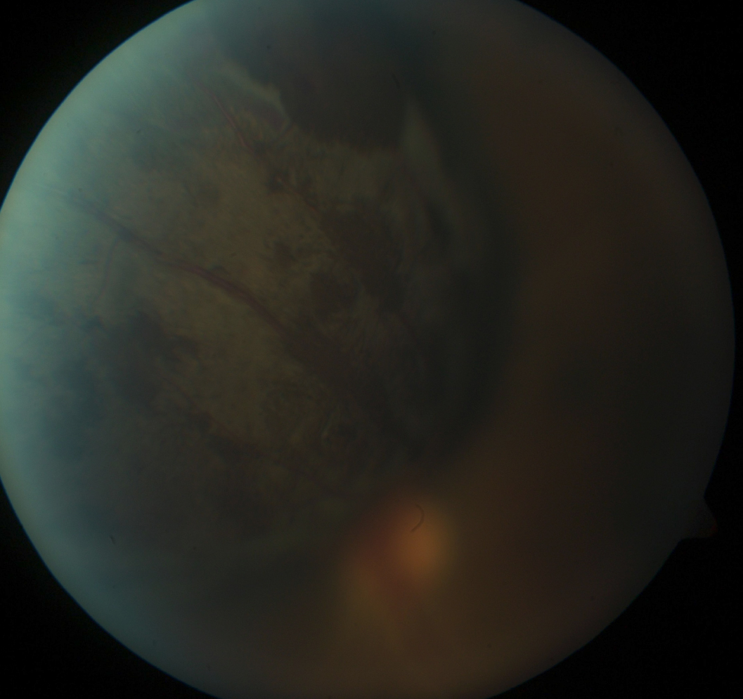 Color fundus photograph of the left eye in Case 1 at initial presentation demonstrates a superonasal pigmented choroidal melanoma.