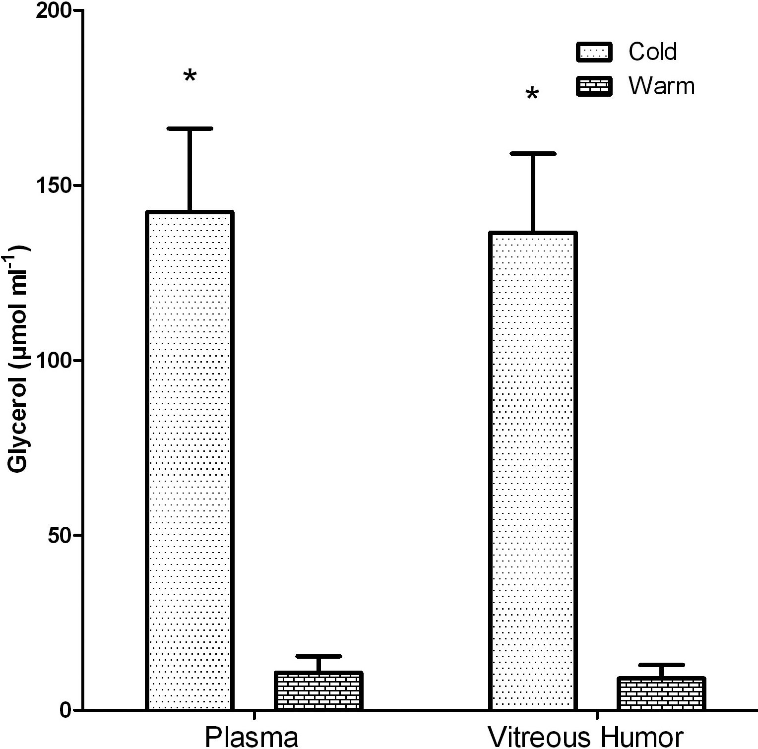 Glycerol levels in the plasma and vitreous fluid of smelt at warm (8–10 °C) and cold (<0.5 °C) temperatures. The values are presented as mean±SEM, with n=5 in all groups. * indicates a statistically significant difference.