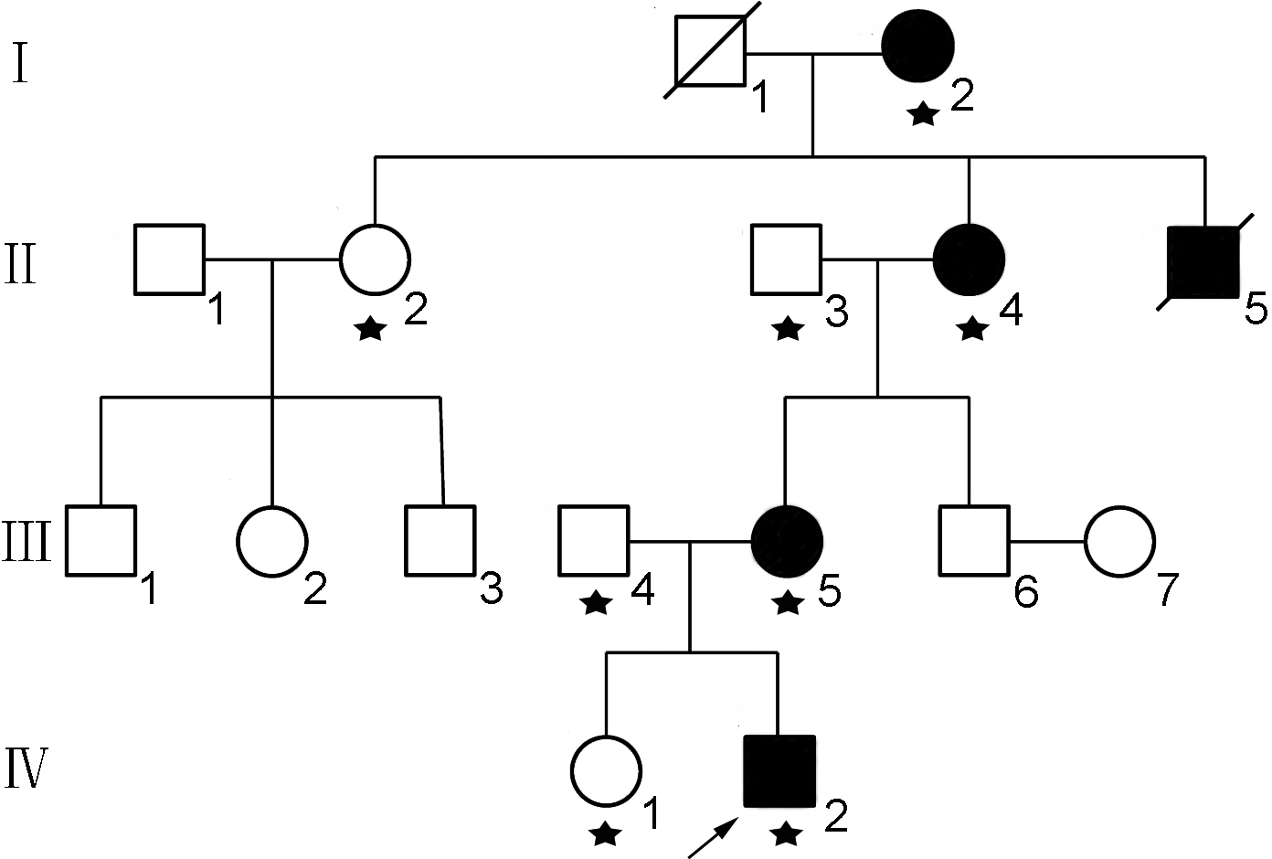 Pedigree of the Chinese family with nystagmus, cataract, and iris anomalies. Filled squares and circles are affected males and females, respectively. Arrowhead indicates proband. The asterisk indicates family members included this study.
