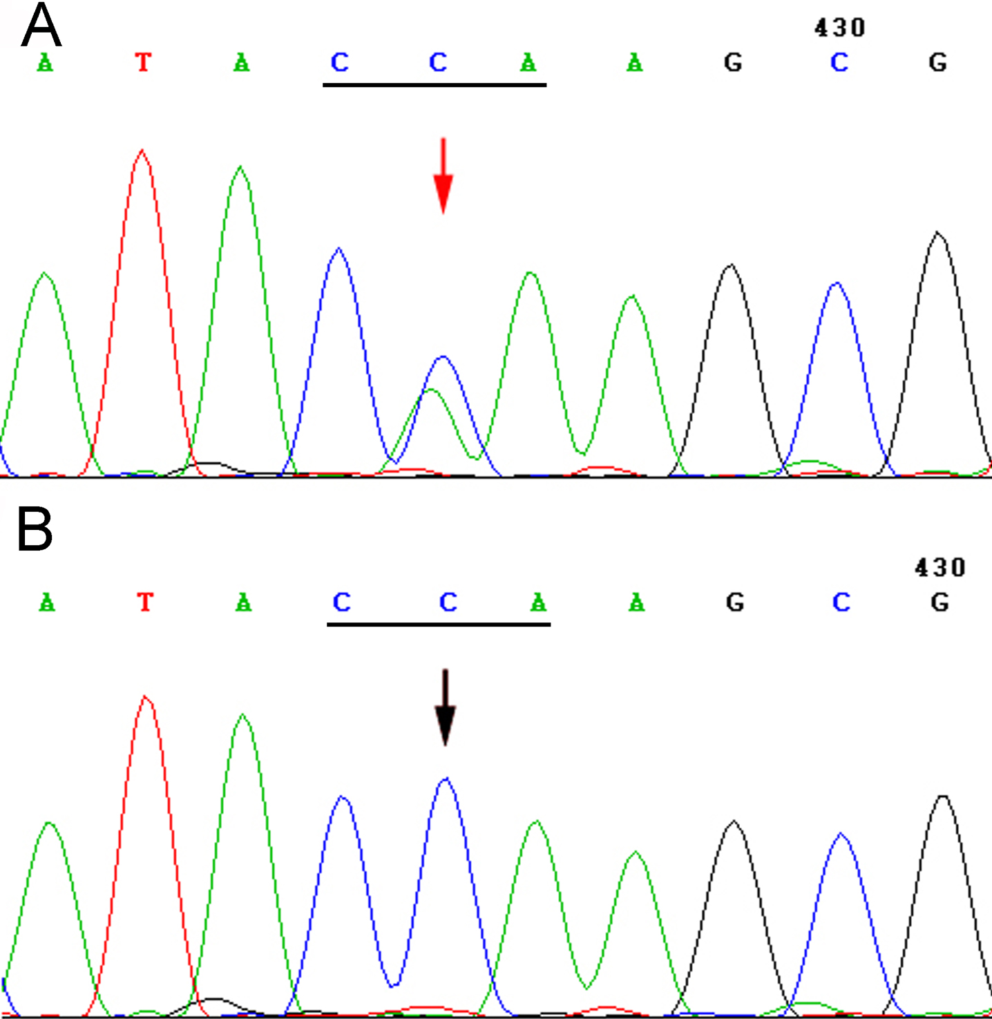: a heterozygous C to A transversion at codon 118 in one patient from the family (arrowhead).