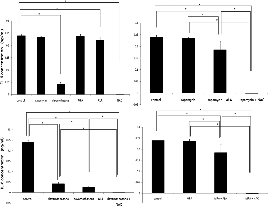 IL-6 levels measured by ELISA. IL-6 levels decreased in treatment with dexamethasone and anti-oxidants (Top left). The combination of immunosuppressants and antioxidants are more effective to suppress the production of IL-6 .