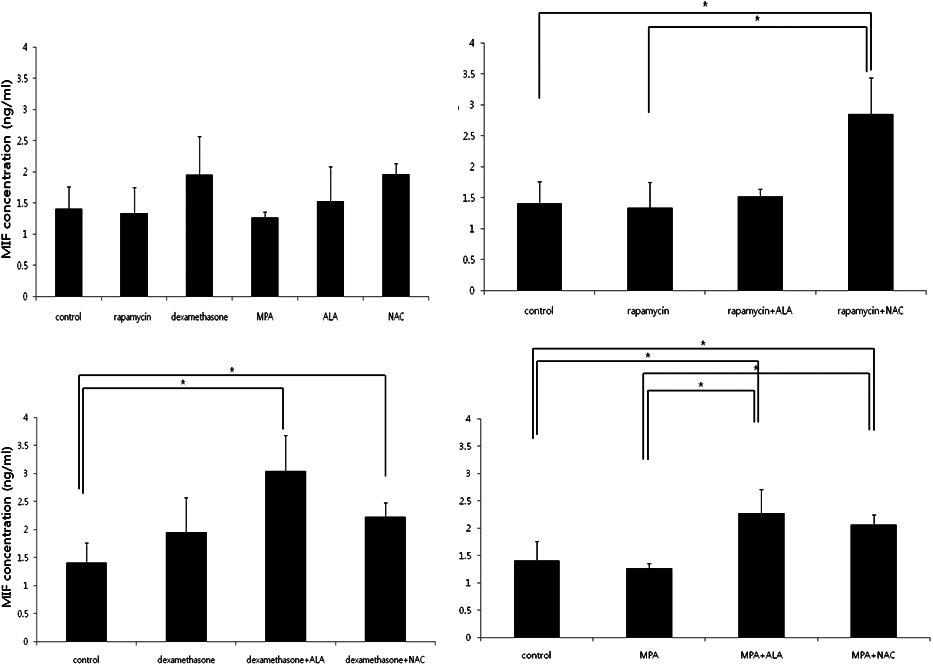 Figure 5. MIF levels measured by ELISA. MIF levels were not different in treatment with each drug (Top left). MIF levels increased in