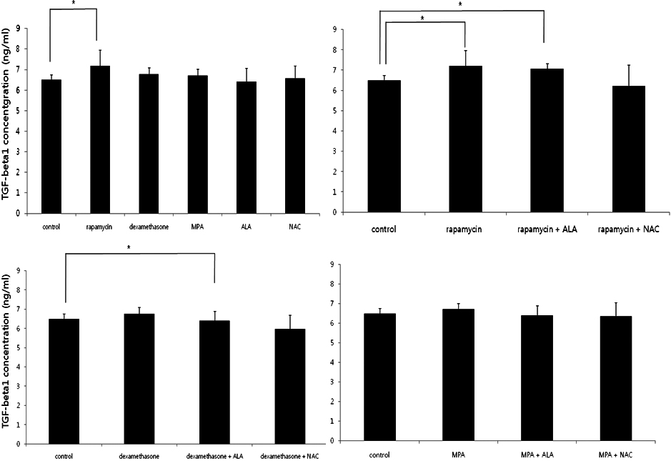 TGF-β1 levels measured by ELISA. TGF-β1 levels were elevated in rapamycin group, rapamycin + ALA group.