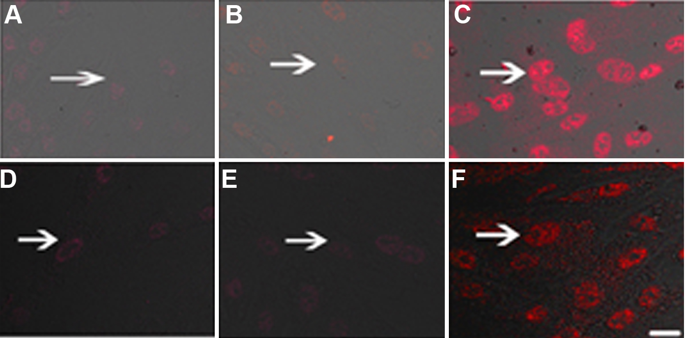 Figure 3. Skp2 siRNA induced p27kip1 accumulationin in PFC in vitro by immunofluorescence. Immunofluorescence staining indicated the expression of p27kip1 dramatically increased in PFC and NFC transfection with Skp2 siRNA (C, F) when compared with PFC transfection with pSuppressor vehicle (A, D) or without transfection (B, E). The scale bar is equal to 40 μm.