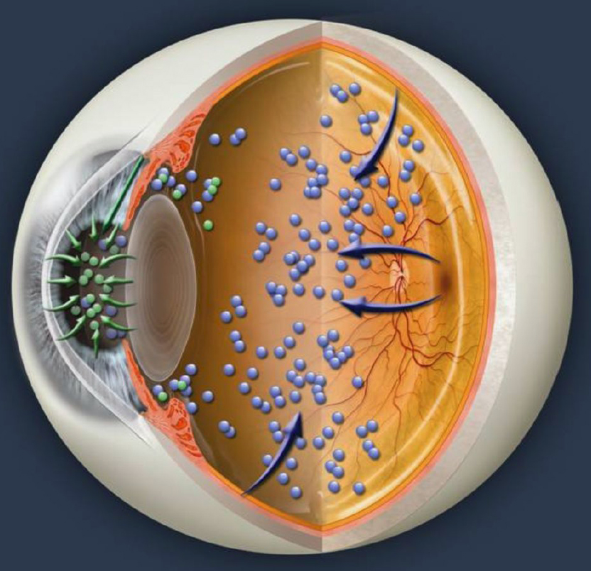 A cross-cut illustration demonstrating how proteins are likely to be produced in the aqueous and vitreous.