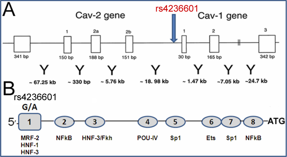 A: Exon-intron structure of the caveolins genes and localization of SNP