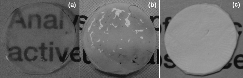 Figure 3. Optical transparency of PCL nanofiber membranes and HAM. A: Wet HAM, showing transparency through which the printed text can be easily read. B: Wet PCL membrane showing translucency through which the printed text is slightly visible. C: Dry PCL membrane showing complete opacity and the text underneath can not be read through it.