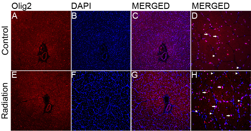 using fluorescence microscopy. Overlay images demonstrate Olig2 and DAPI double positive cells. The cells positive for Olig2