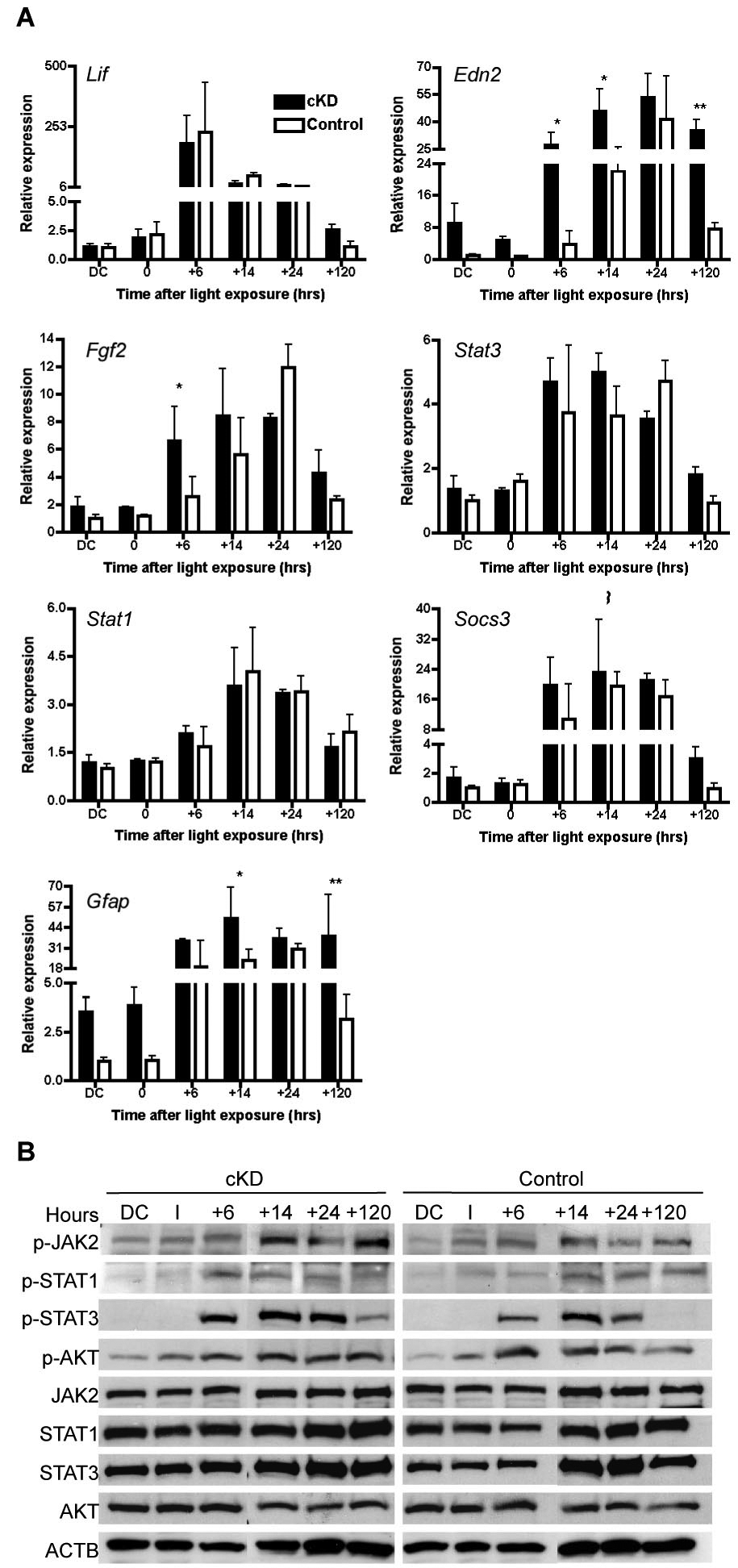 (ANOVA) followed by a bonferroni post-hoc test. * p<0.05; ** p<0.01; *** p<0.001. B: Total retinal extracts from Cdc42 cKD and wild type controls (control) at indicated time points after light exposure (as in A) were immunoblotted. Shown are representative blots of n=3.
